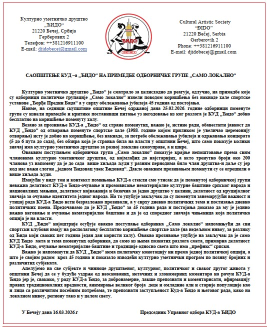 На наводе који се односе на бесплатно коришћење сале у згради УСКАО „Ђорђе Предин – Баџа“, за потребе одржавања концерта, током расправе о годишњем плану ове установе за 2026. годину на 16. седници СО Бечеј, КУД „Ђидо“ је медијима послао следеће саопштење које преносимо у целости: