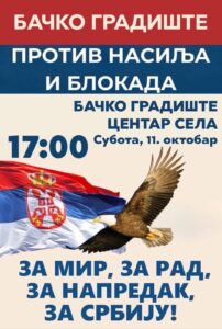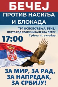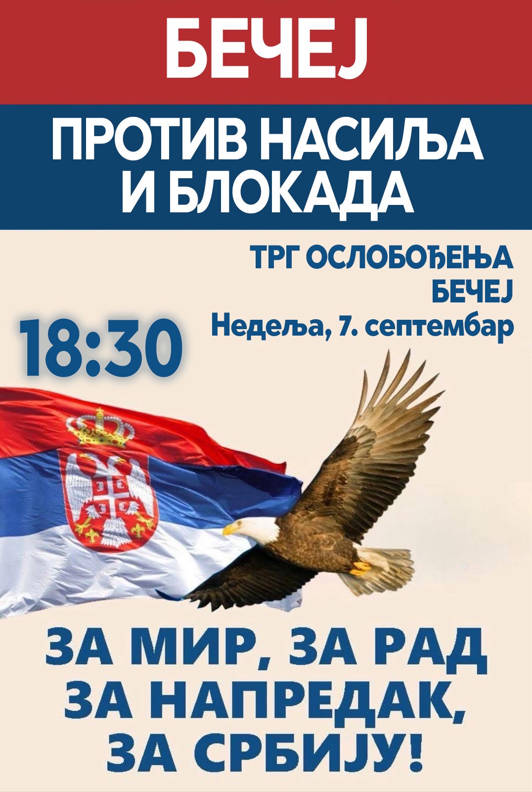 „Позив грађанима Бечеја, Позивамо све заинтересоване суграђане да у недељу, 7. септембра у 18:30 часова, на Тргу ослобођења у Бечеју, узму учешће у скупу под називом „Против насиља и блокада“. Окупљањем желимо да пошаљемо јасну поруку заједништва, мира и посвећености раду и напретку наше заједнице и Србије. Ваше присуство и подршка биће од великог значаја за очување вредности које нас уједињују.“